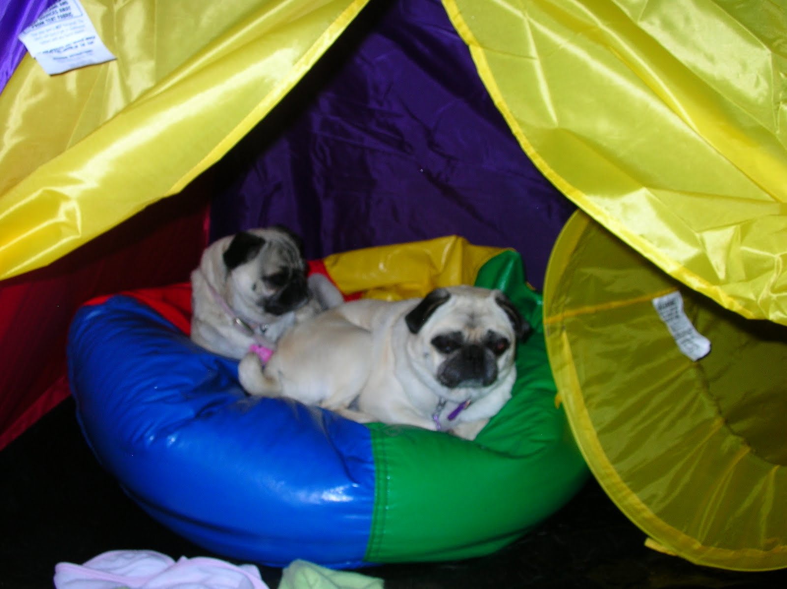 We turned our basement Family room into a playroom free-for-all. We have two play kitchens, a teeter-totter, two grocery carts, a Dora play tent and a Discovery Kids tent with tunnel. We set the bean bag in the tent for the kids ... but look who is in there ALL of the time. Have you ever seen anything more precious?